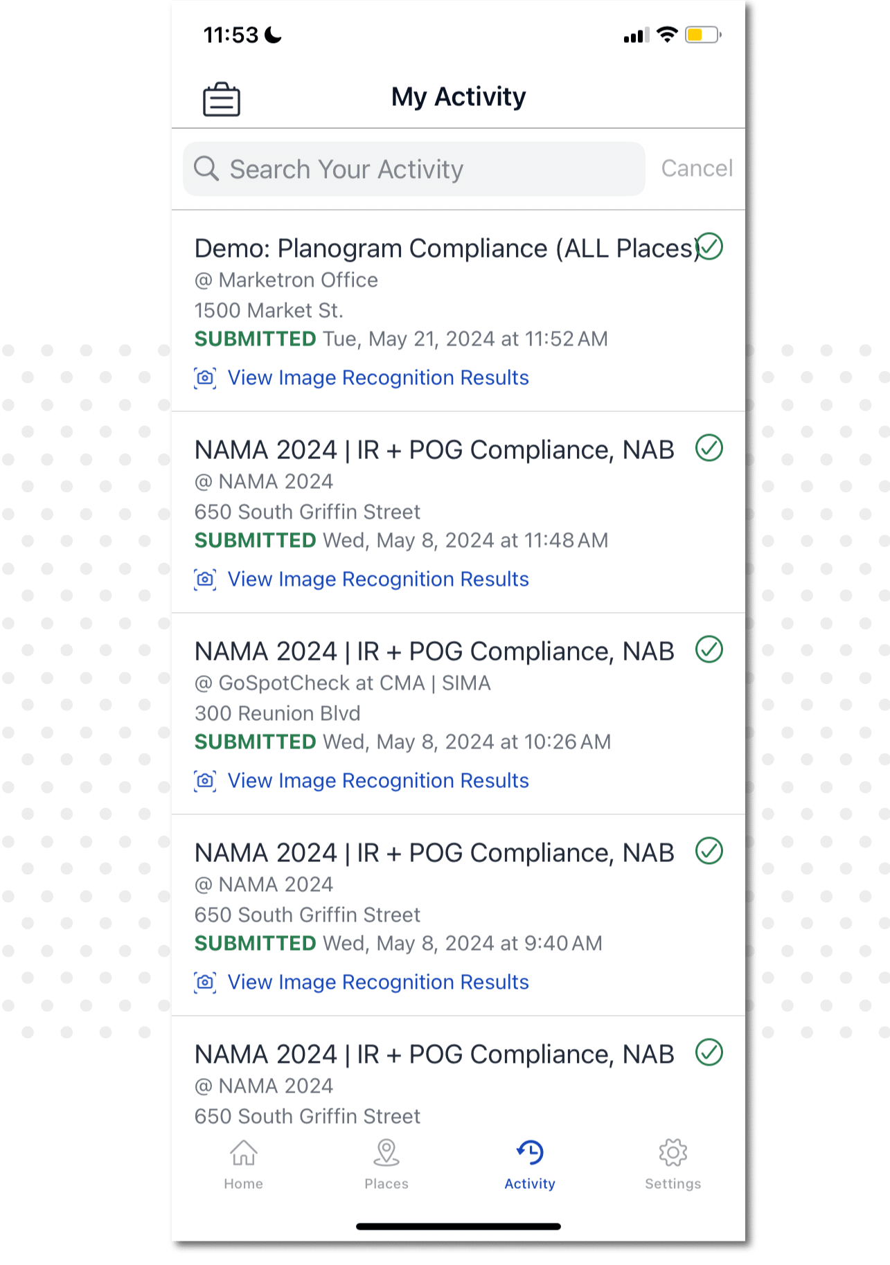 On the home screen, there is a summary of the user account and notifications. You can also access past activity to review historical data, but we are going straight to Places and selecting what we want to do here. Let’s start the Demo: Planogram Compliance Mission.