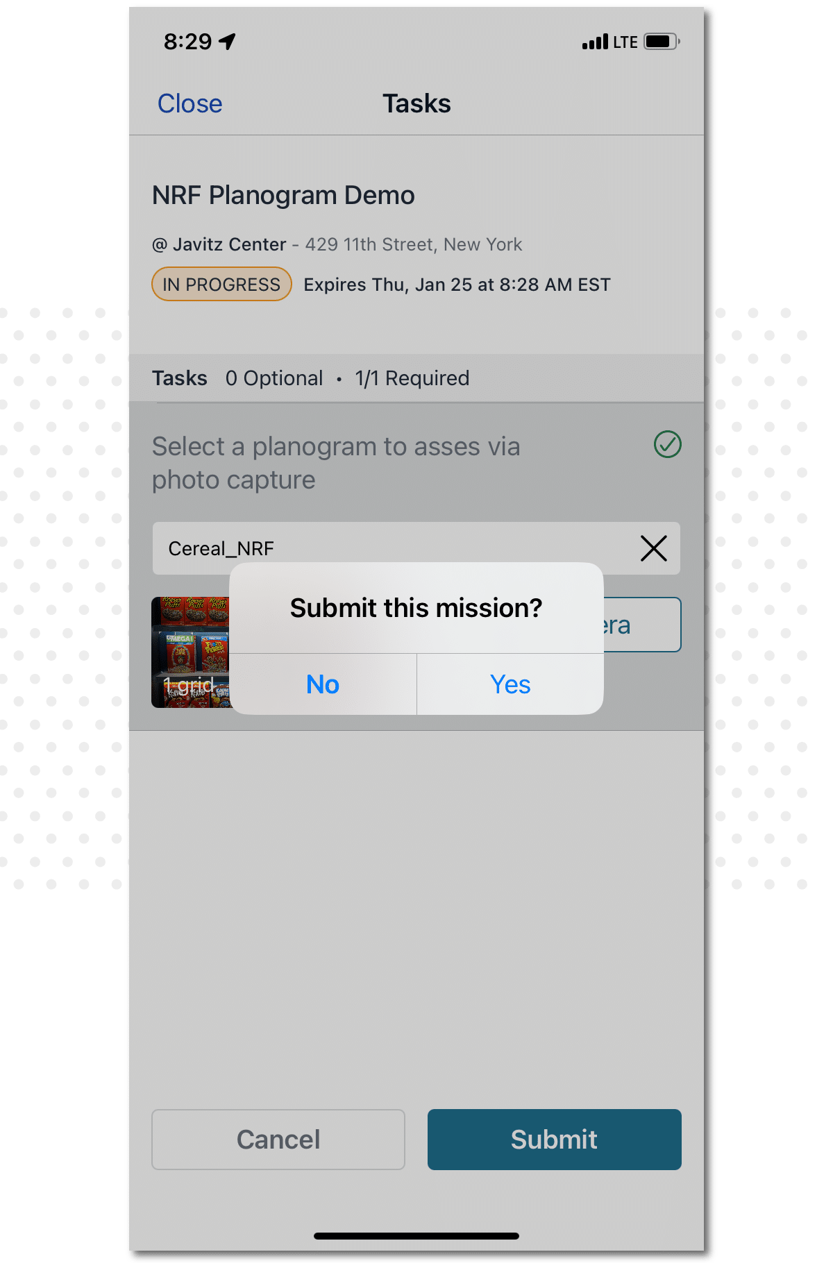 Within a Mission, we can display a list of survey-like questions to request follow-ups, log notes, and track other KPIs, but let’s go straight to the photo capture.